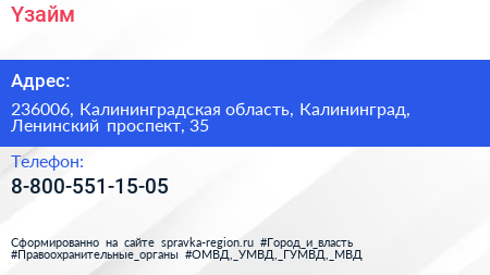 Yзайм по адресу 236006, Калининградская область, Калининград, Ленинский проспект, 35 в дальнейшем Организация, размещена в следующих категориях: