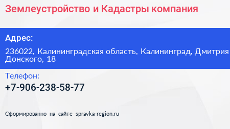 Землеустройство и Кадастры, компания по адресу 236022, Калининградская область, Калининград, Дмитрия Донского, 18 в дальнейшем Организация, размещена в следующих категориях: