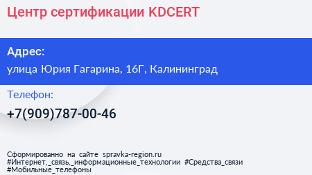 Центр сертификации KDCERT по адресу улица Юрия Гагарина, 16Г, Калининград в дальнейшем Организация, размещена в следующих категориях:
