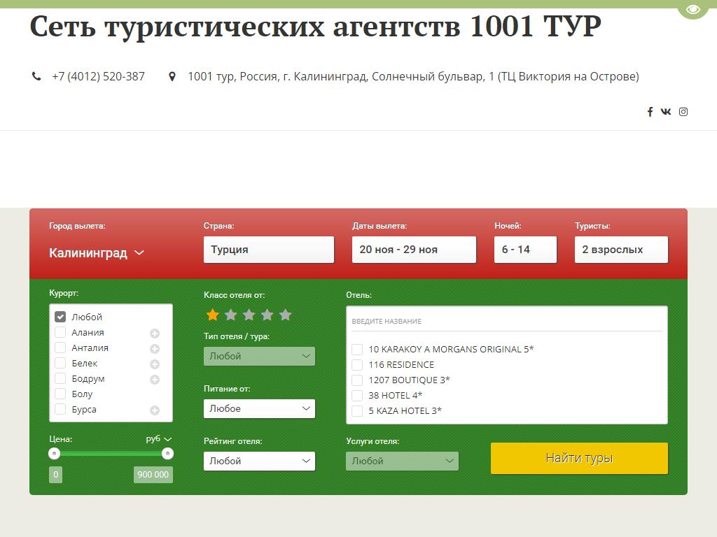 1001 Тур, туристическое агентство по адресу 236006, Калининградская область, Калининград, Солнечный бульвар, 1 в дальнейшем Организация, размещена в следующих категориях: