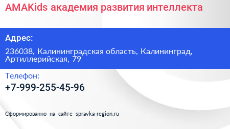 AMAKids, академия развития интеллекта по адресу 236038, Калининградская область, Калининград, Артиллерийская, 79 в дальнейшем Организация, размещена в следующих категориях: