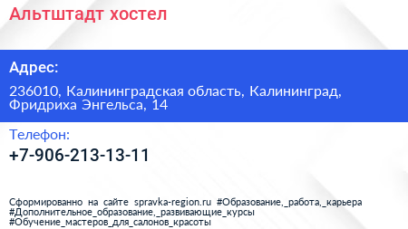 Альтштадт, хостел по адресу 236010, Калининградская область, Калининград, Фридриха Энгельса, 14 в дальнейшем Организация, размещена в следующих категориях: