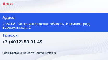 Арго по адресу 236006, Калининградская область, Калининград, Барнаульская, 2 в дальнейшем Организация, размещена в следующих категориях: