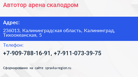 Автотор-арена, скалодром по адресу 236013, Калининградская область, Калининград, Тихоокеанская, 5 в дальнейшем Организация, размещена в следующих категориях: