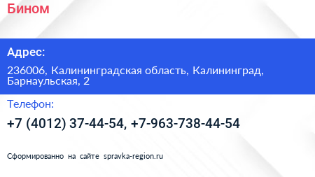 Бином по адресу 236006, Калининградская область, Калининград, Барнаульская, 2 в дальнейшем Организация, размещена в следующих категориях: