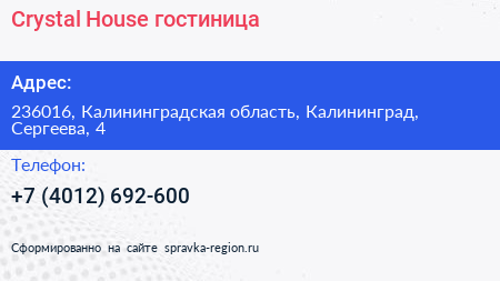 Crystal House, гостиница по адресу 236016, Калининградская область, Калининград, Сергеева, 4 в дальнейшем Организация, размещена в следующих категориях: