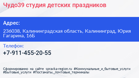 Чудо39, студия детских праздников по адресу 236038, Калининградская область, Калининград, Юрия Гагарина, 16Б в дальнейшем Организация, размещена в следующих категориях: