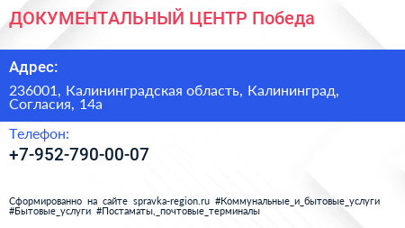 ДОКУМЕНТАЛЬНЫЙ ЦЕНТР Победа по адресу 236001, Калининградская область, Калининград, Согласия, 14а в дальнейшем Организация, размещена в следующих категориях: