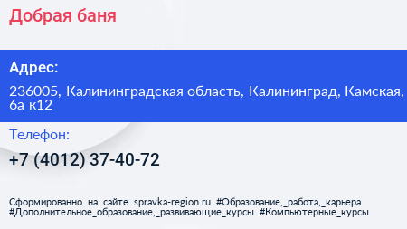 Добрая баня по адресу 236005, Калининградская область, Калининград, Камская, 6а к12 в дальнейшем Организация, размещена в следующих категориях: