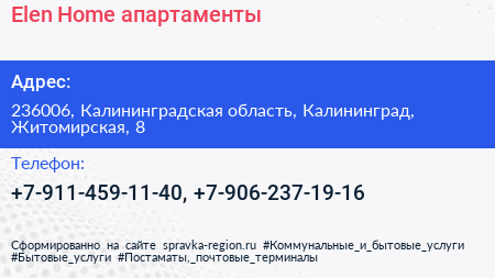 Elen Home, апартаменты по адресу 236006, Калининградская область, Калининград, Житомирская, 8 в дальнейшем Организация, размещена в следующих категориях: