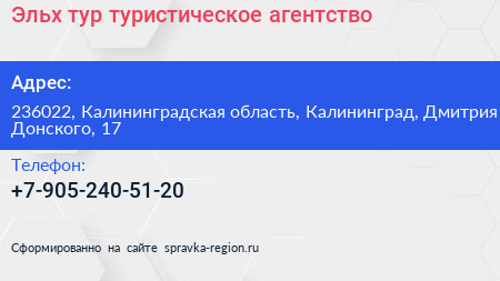 Эльх-тур, туристическое агентство по адресу 236022, Калининградская область, Калининград, Дмитрия Донского, 17 в дальнейшем Организация, размещена в следующих категориях: