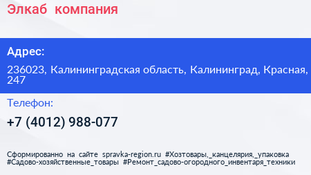 Элкаб+, компания по адресу 236023, Калининградская область, Калининград, Красная, 247 в дальнейшем Организация, размещена в следующих категориях:
