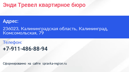 Энди-Тревел, квартирное бюро по адресу 236023, Калининградская область, Калининград, Комсомольская, 79 в дальнейшем Организация, размещена в следующих категориях: