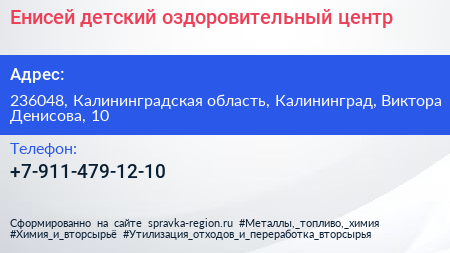 Енисей, детский оздоровительный центр по адресу 236048, Калининградская область, Калининград, Виктора Денисова, 10 в дальнейшем Организация, размещена в следующих категориях: