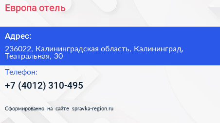 Европа, отель по адресу 236022, Калининградская область, Калининград, Театральная, 30 в дальнейшем Организация, размещена в следующих категориях: