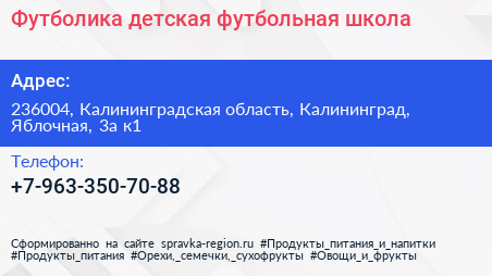 Футболика, детская футбольная школа по адресу 236004, Калининградская область, Калининград, Яблочная, 3а к1 в дальнейшем Организация, размещена в следующих категориях: