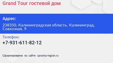 Grand Tour, гостевой дом по адресу 238350, Калининградская область, Калининград, Совхозная, 9 в дальнейшем Организация, размещена в следующих категориях: