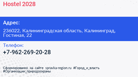 Hostel 2028 по адресу 236022, Калининградская область, Калининград, Гостиная, 22 в дальнейшем Организация, размещена в следующих категориях: