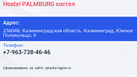 Hostel PALMBURG, хостел по адресу 236048, Калининградская область, Калининград, Южное Полукольцо, 4 в дальнейшем Организация, размещена в следующих категориях: