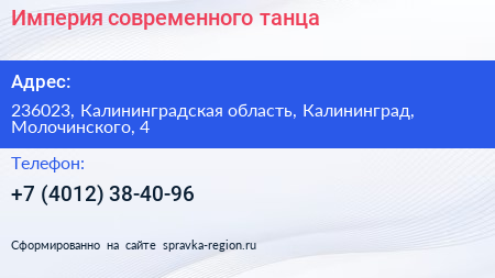 Империя современного танца по адресу 236023, Калининградская область, Калининград, Молочинского, 4 в дальнейшем Организация, размещена в следующих категориях: