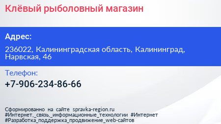 Клёвый, рыболовный магазин по адресу 236022, Калининградская область, Калининград, Нарвская, 46 в дальнейшем Организация, размещена в следующих категориях: