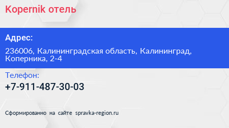 Kopernik, отель по адресу 236006, Калининградская область, Калининград, Коперника, 2-4 в дальнейшем Организация, размещена в следующих категориях: