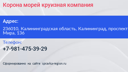Корона морей, круизная компания по адресу 236010, Калининградская область, Калининград, проспект Мира, 136 в дальнейшем Организация, размещена в следующих категориях: