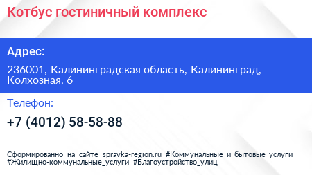 Котбус, гостиничный комплекс по адресу 236001, Калининградская область, Калининград, Колхозная, 6 в дальнейшем Организация, размещена в следующих категориях: