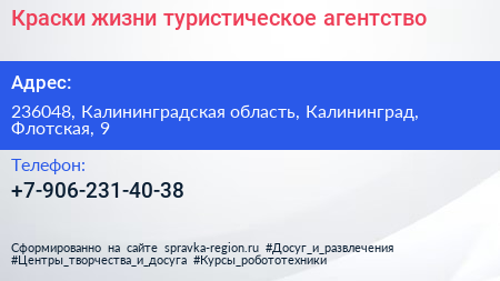 Краски жизни, туристическое агентство по адресу 236048, Калининградская область, Калининград, Флотская, 9 в дальнейшем Организация, размещена в следующих категориях: