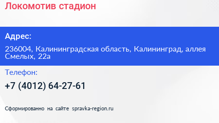Локомотив, стадион по адресу 236004, Калининградская область, Калининград, аллея Смелых, 22а в дальнейшем Организация, размещена в следующих категориях: