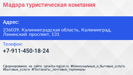Мадэра, туристическая компания по адресу 236039, Калининградская область, Калининград, Ленинский проспект, 131 в дальнейшем Организация, размещена в следующих категориях:
