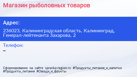 Магазин рыболовных товаров по адресу 236023, Калининградская область, Калининград, Генерал-лейтенанта Захарова, 2 в дальнейшем Организация, размещена в следующих категориях: