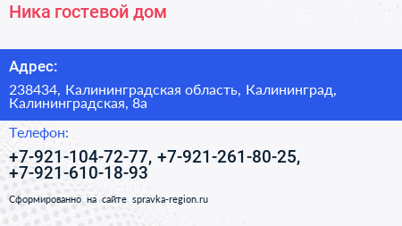 Ника, гостевой дом по адресу 238434, Калининградская область, Калининград, Калининградская, 8а в дальнейшем Организация, размещена в следующих категориях: