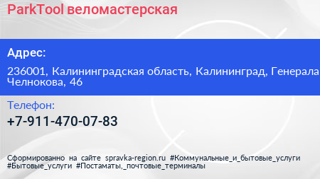 ParkTool, веломастерская по адресу 236001, Калининградская область, Калининград, Генерала Челнокова, 46 в дальнейшем Организация, размещена в следующих категориях: