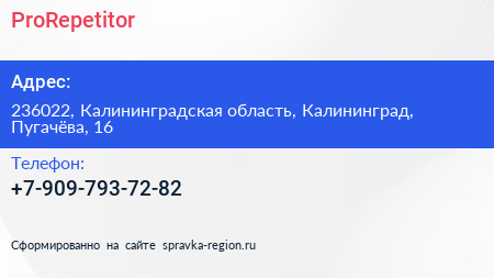 ProRepetitor по адресу 236022, Калининградская область, Калининград, Пугачёва, 16 в дальнейшем Организация, размещена в следующих категориях: