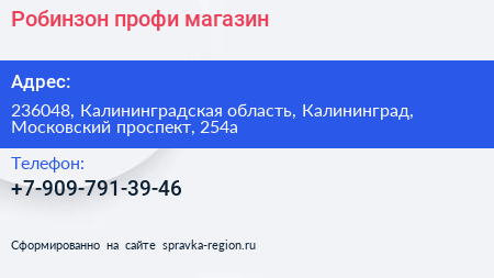 Робинзон профи, магазин по адресу 236048, Калининградская область, Калининград, Московский проспект, 254а в дальнейшем Организация, размещена в следующих категориях: