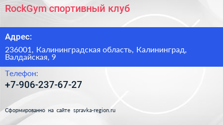RockGym, спортивный клуб по адресу 236001, Калининградская область, Калининград, Валдайская, 9 в дальнейшем Организация, размещена в следующих категориях: