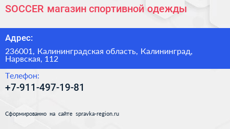 SOCCER, магазин спортивной одежды по адресу 236001, Калининградская область, Калининград, Нарвская, 112 в дальнейшем Организация, размещена в следующих категориях: