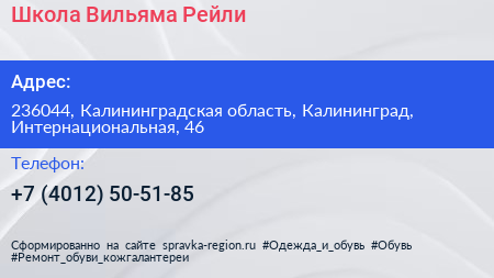 Школа Вильяма Рейли по адресу 236044, Калининградская область, Калининград, Интернациональная, 46 в дальнейшем Организация, размещена в следующих категориях: