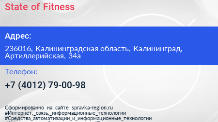 State of Fitness по адресу 236016, Калининградская область, Калининград, Артиллерийская, 34а в дальнейшем Организация, размещена в следующих категориях: