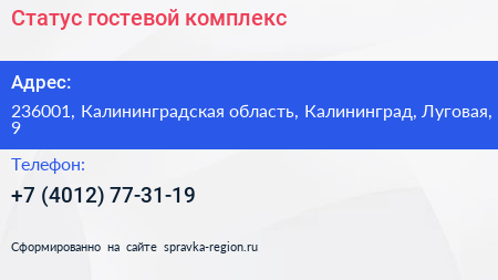 Статус, гостевой комплекс по адресу 236001, Калининградская область, Калининград, Луговая, 9 в дальнейшем Организация, размещена в следующих категориях: