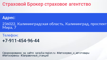 Страховой Брокер, страховое агентство по адресу 236022, Калининградская область, Калининград, проспект Мира, 7 в дальнейшем Организация, размещена в следующих категориях: