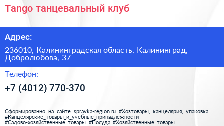 Tango, танцевальный клуб по адресу 236010, Калининградская область, Калининград, Добролюбова, 37 в дальнейшем Организация, размещена в следующих категориях:
