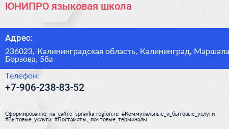 ЮНИПРО, языковая школа по адресу 236023, Калининградская область, Калининград, Маршала Борзова, 58а в дальнейшем Организация, размещена в следующих категориях: