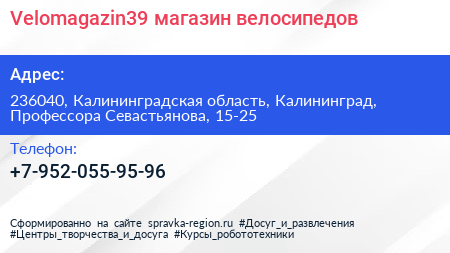 Velomagazin39, магазин велосипедов по адресу 236040, Калининградская область, Калининград, Профессора Севастьянова, 15-25 в дальнейшем Организация, размещена в следующих категориях: