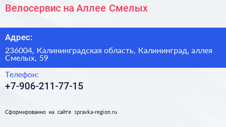 Велосервис на Аллее Смелых по адресу 236004, Калининградская область, Калининград, аллея Смелых, 59 в дальнейшем Организация, размещена в следующих категориях: