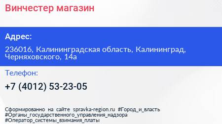 Винчестер, магазин по адресу 236016, Калининградская область, Калининград, Черняховского, 14а в дальнейшем Организация, размещена в следующих категориях: