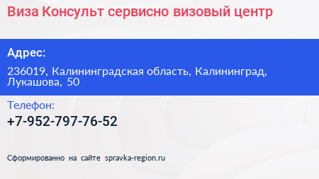 Виза Консульт, сервисно-визовый центр по адресу 236019, Калининградская область, Калининград, Лукашова, 50 в дальнейшем Организация, размещена в следующих категориях: