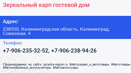 Зеркальный карп, гостевой дом по адресу 238350, Калининградская область, Калининград, Совхозная, 4 в дальнейшем Организация, размещена в следующих категориях: