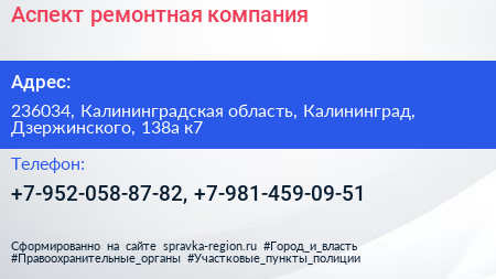 Аспект, ремонтная компания по адресу 236034, Калининградская область, Калининград, Дзержинского, 138а к7 в дальнейшем Организация, размещена в следующих категориях: